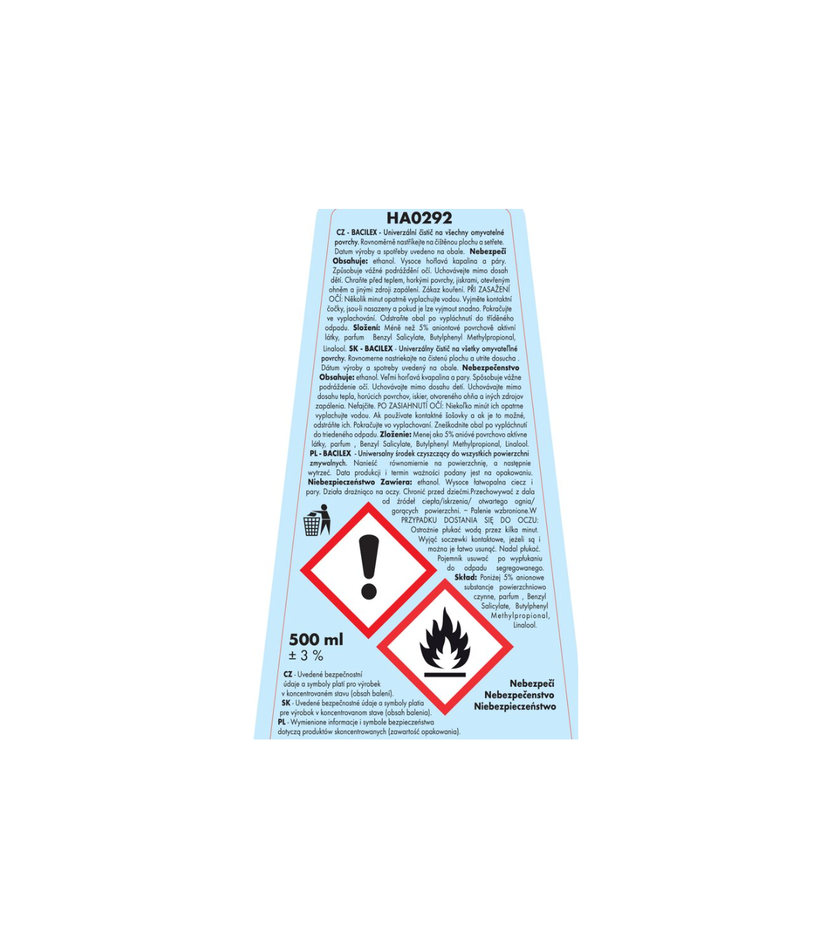 - Hygienický čistič hladkých povrchů s vysokým obsahem alkoholu 70 %, BACILEX
