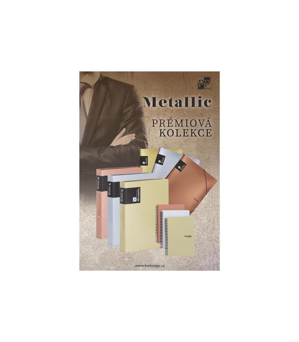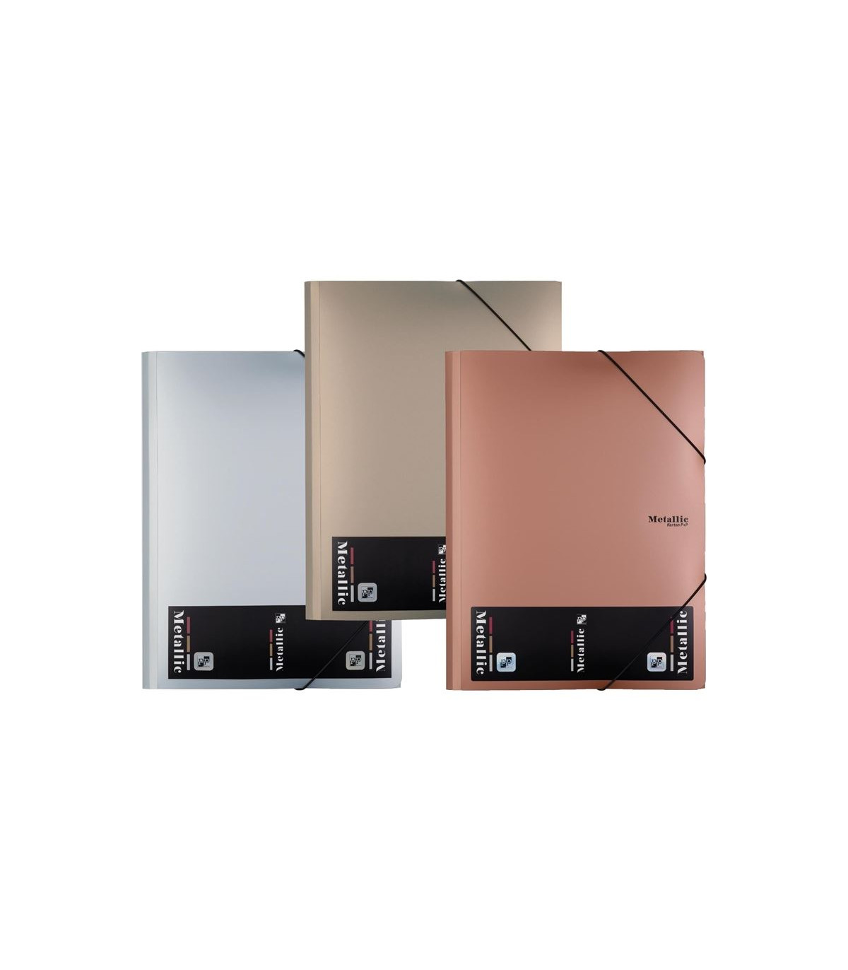 - Tříklopá složka v metalických barvách se zajišťovcí gumičkou přes rohy, která zabraňuje vypadávání dokumentů