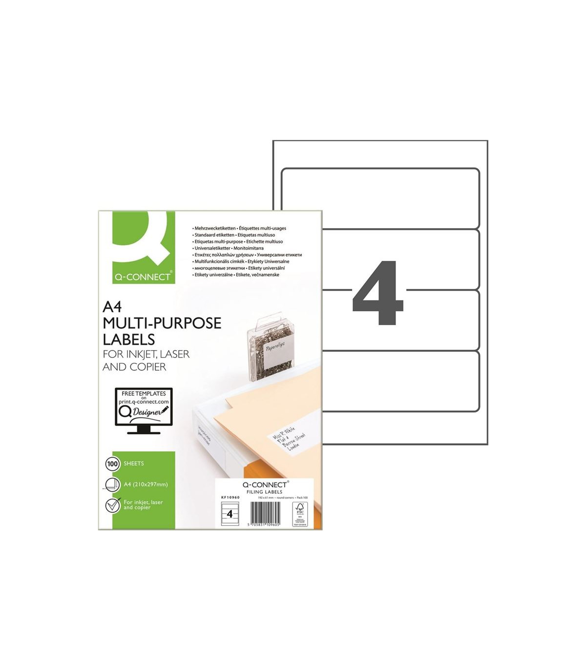 Etikety na pořadače Q-Connect, Barva bílá, Rozměr 192 x 61 mm, Vhodné pro šanony s hřbetem 8 cm, 1 arch 4 etikety, V balení 400 ks, Cena za balení