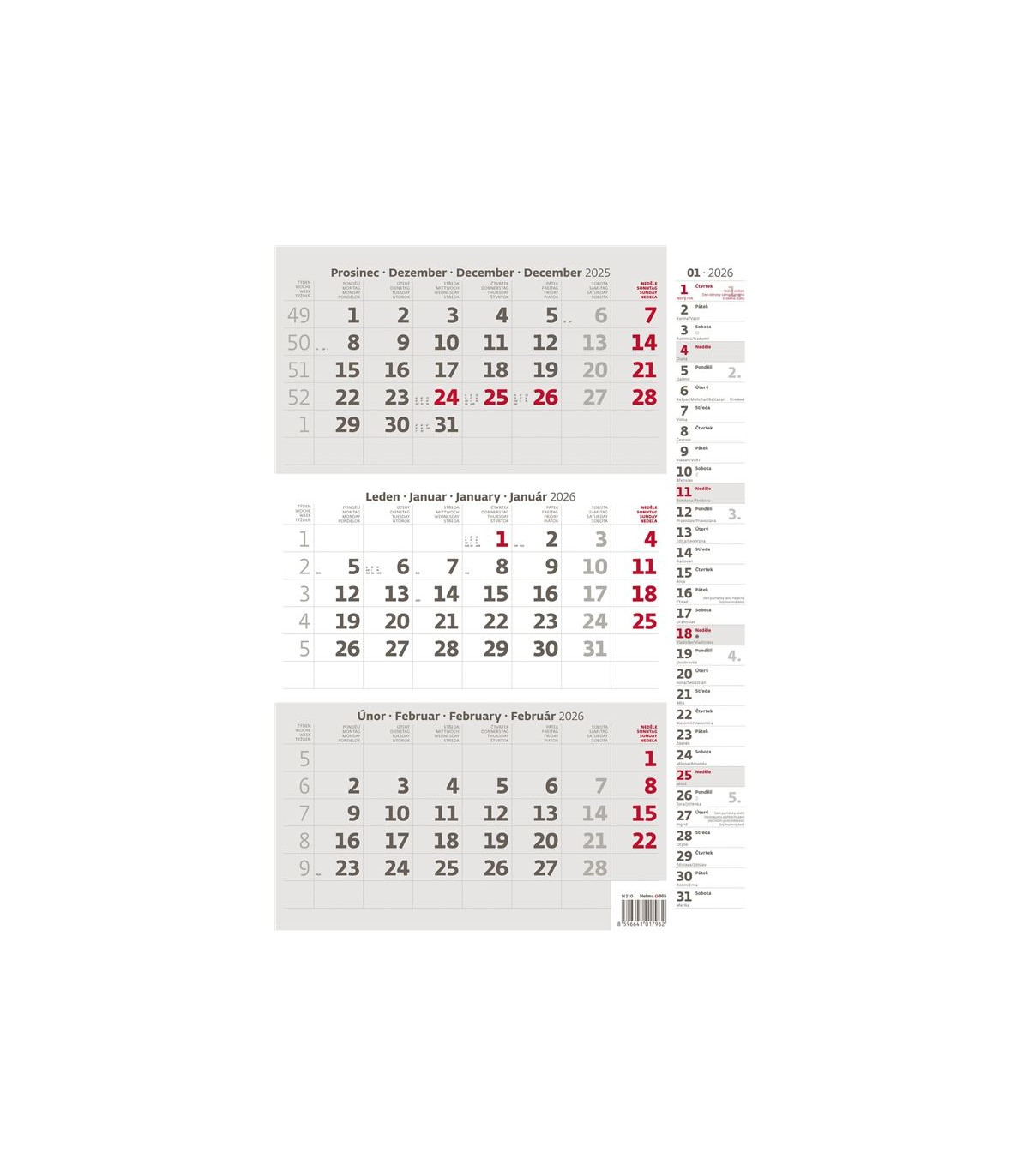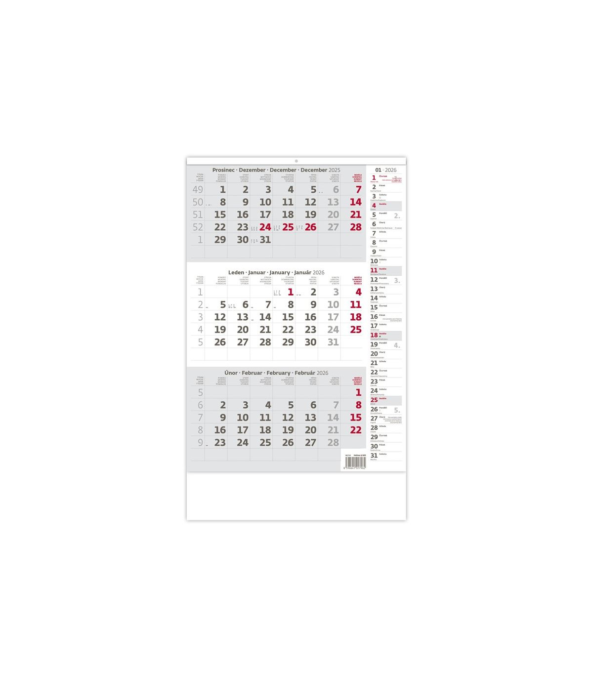 Tříměsíční kalendář 2026 - poznámkový, Barva šedá, Rozměr: 31,5 x 45 cm, Provedení nástěnné, Závěsné provedení, Počet listů 12, Cena z ks