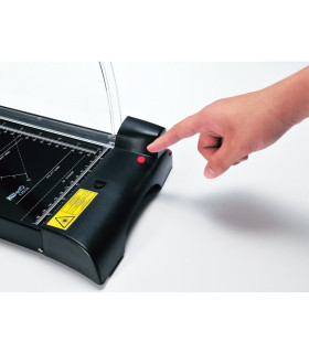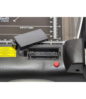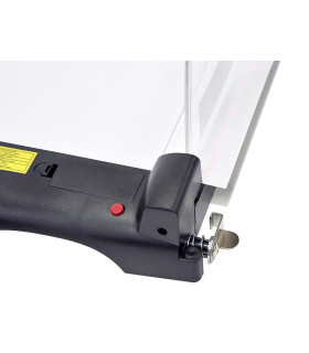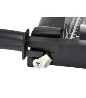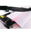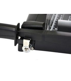 - S plastovým ochranným krytem, plastovým stolem s vyznačenými měřítky a DIN formáty, s posuvným dorazem papíru.