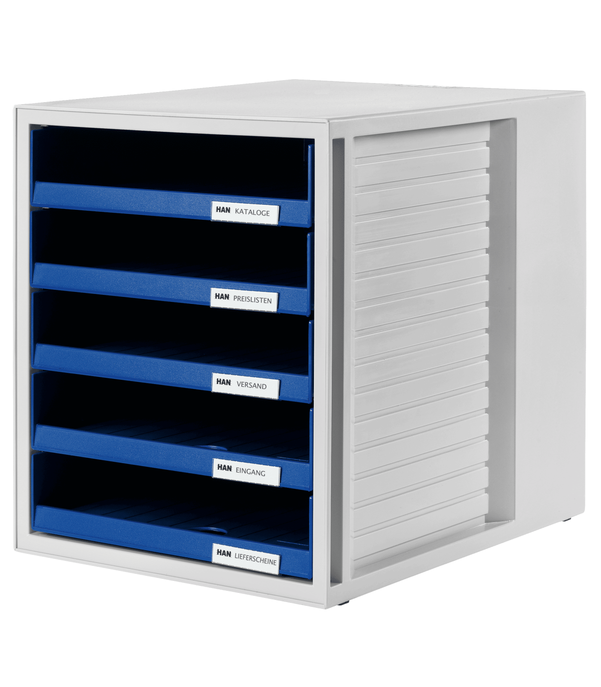 - Zásuvkový box KARMA s 5 zásuvkami na papír formátu DIN A4 a větší oceněný ekologickým certifikátem "BLUE ANGEL"