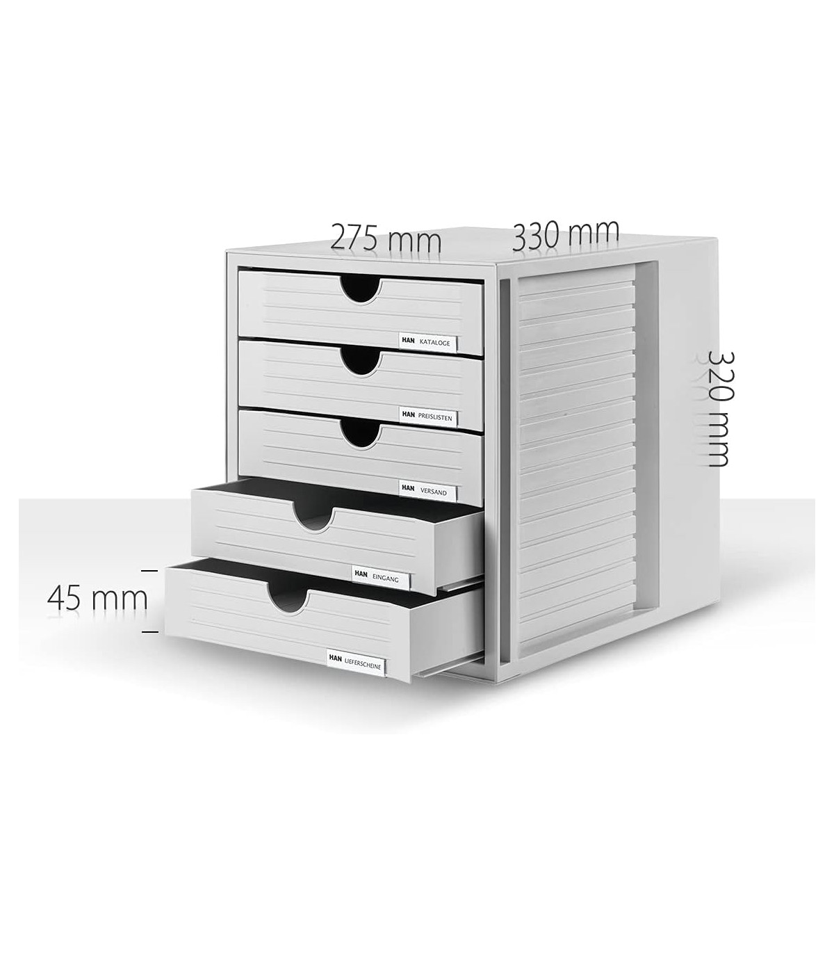 - Vnější výška a hloubka jsou přizpůsobeny výšce pořadačů nebo přihrádky na dokumenty